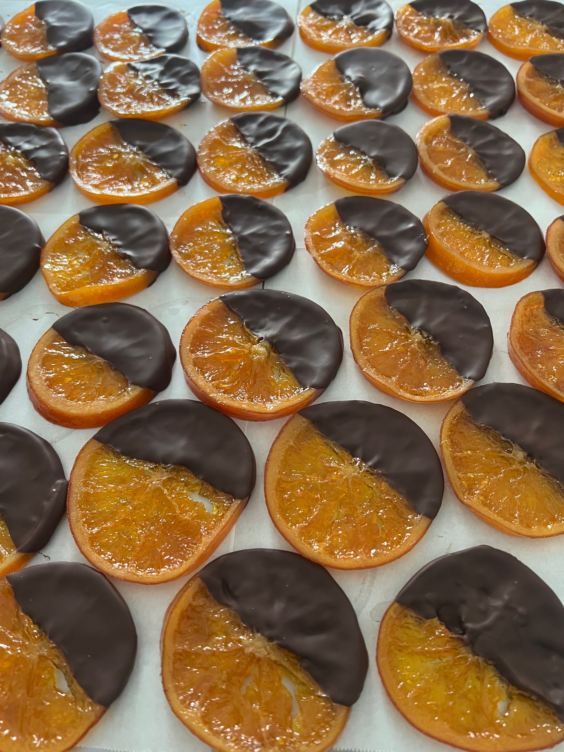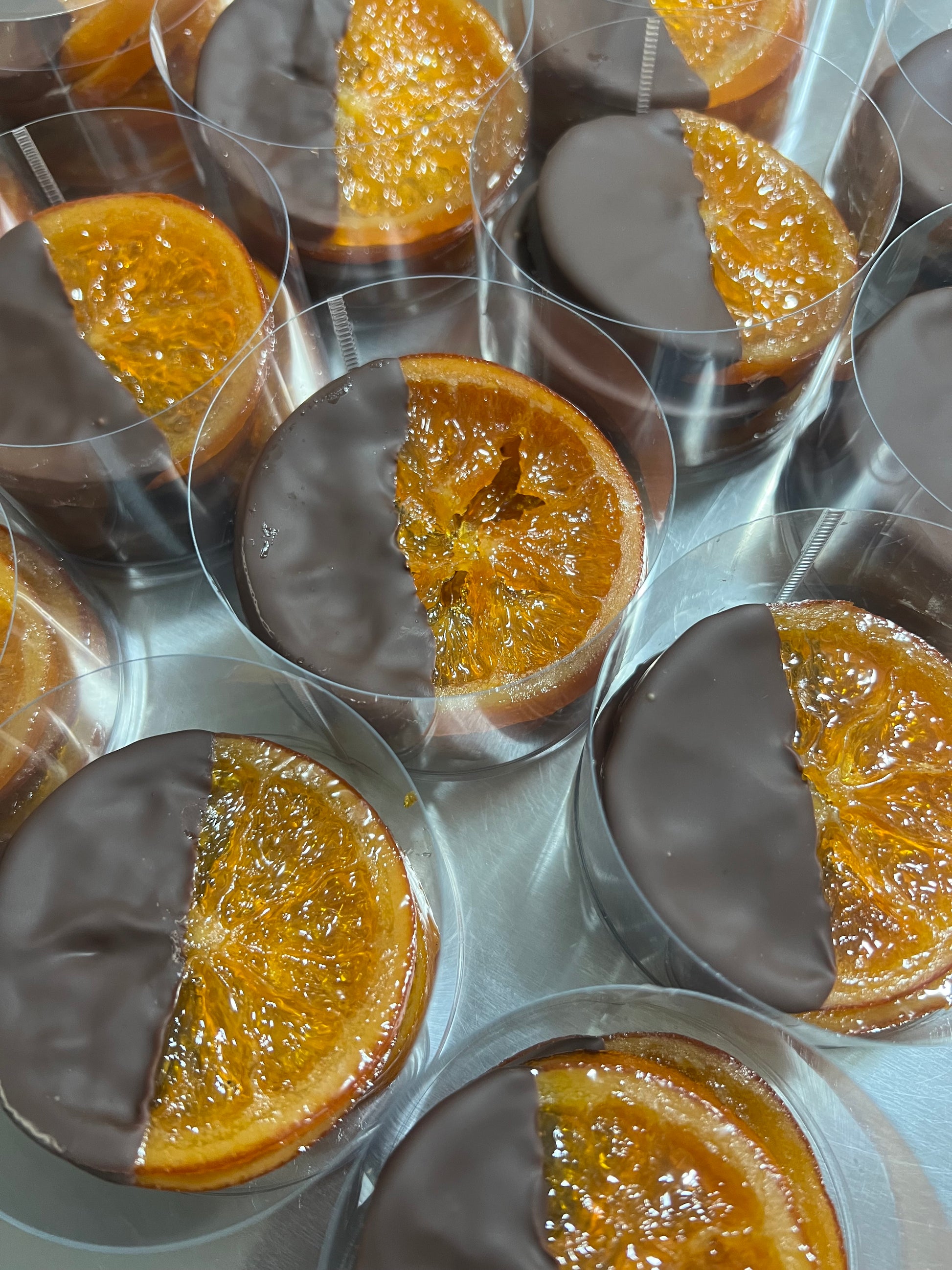 瀬戸田産有機栽培ネーブルを輪切りにして何日もかけてじっくり糖度をあげてコンフィにしたものをドライにしてビターチョコレートをかけたオランジェットです。